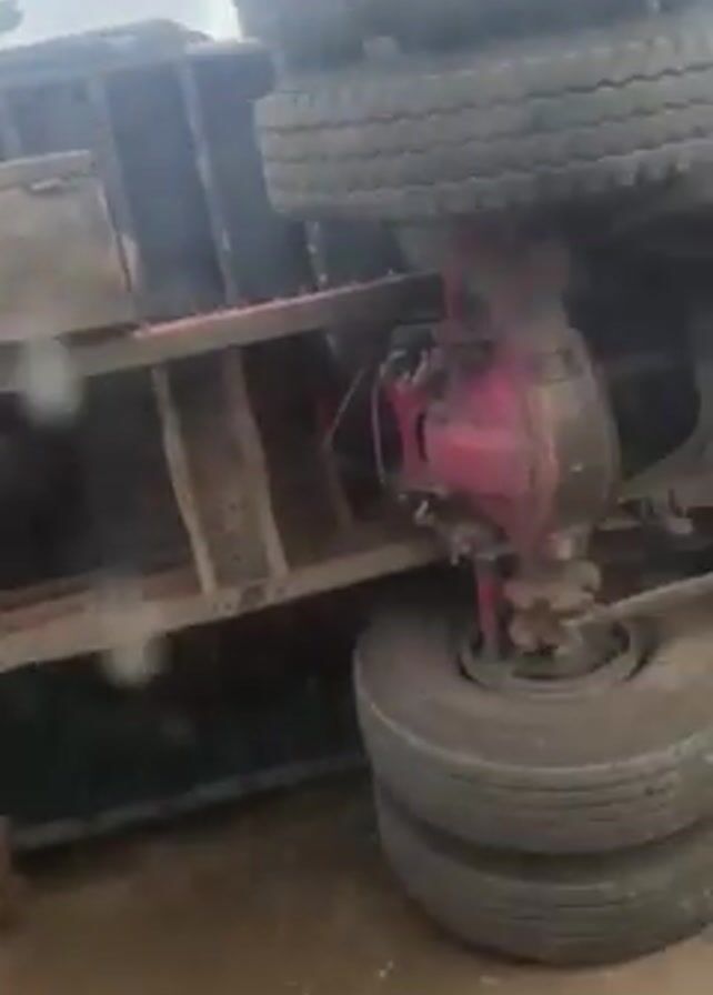 large truck lying on its side in what appears to be a rural or semi-rural setting