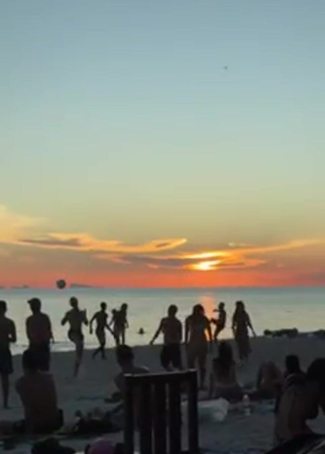 group of people playing on a beach at sunset. The sun is setting over the ocean, creating a warm, orange glow. There are silhouettes of people playing with a ball on the beach, and others relaxing in the foreground. A few chairs and beach bags are visible. The sky is a clear blue, transitioning to orange near the horizon.