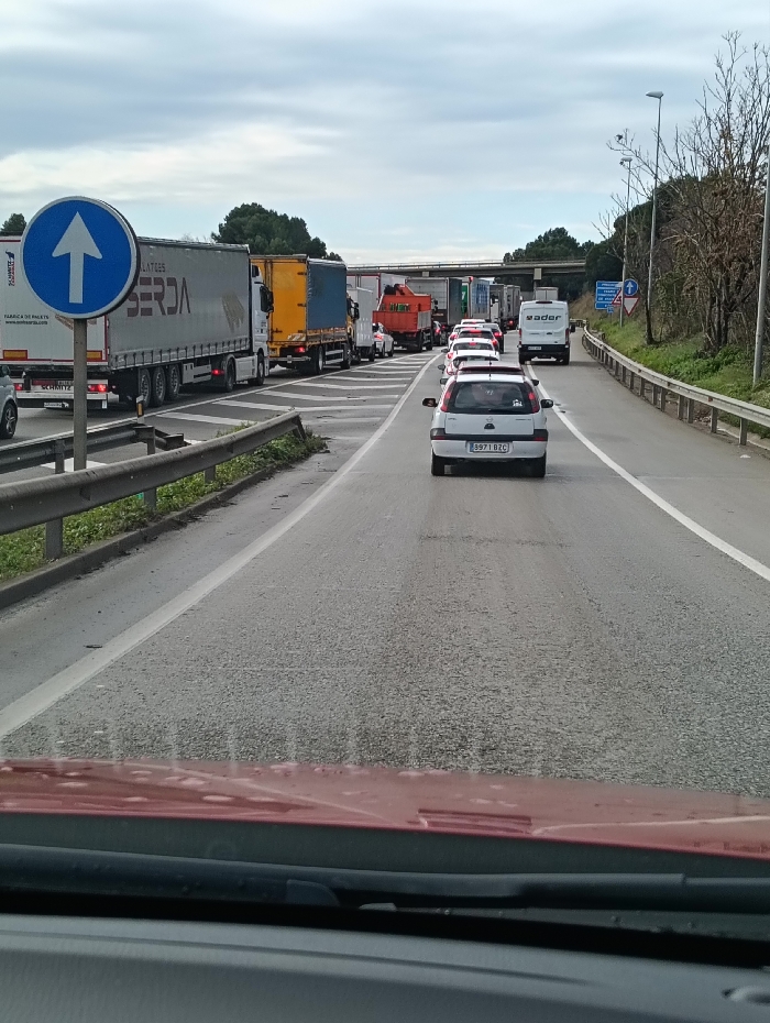 The image displays a multi-lane road with heavy traffic congestion in Barberà del Vallès, Spain