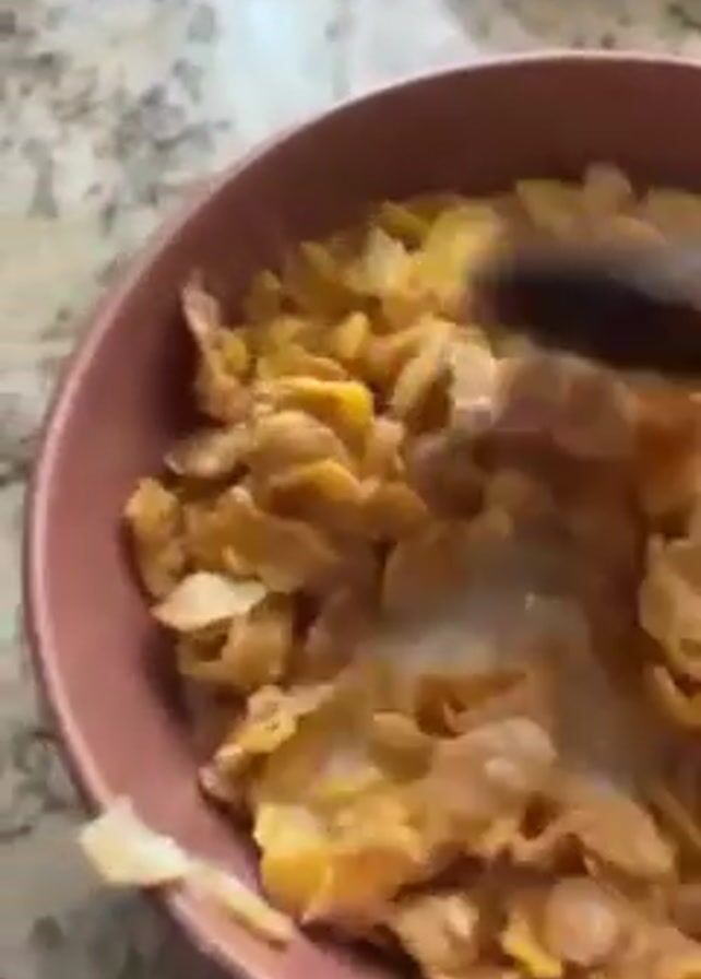pink bowl of cornflakes with milk being stirred with a black spoon