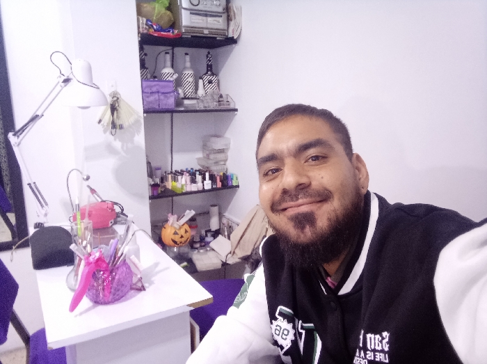 A man with dark hair and a beard smiles at the camera. He is wearing a black and white varsity jacket. Behind him is a manicure station with a white table, a lamp, and various manicure tools. A shelf unit holds nail polish bottles, decorative bottles, and a small decorative pumpkin. The background is a plain white wall.