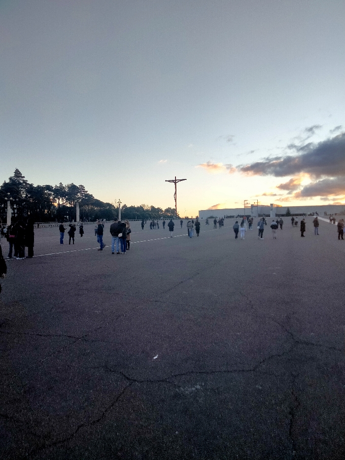 A large open paved area is filled with many people. In the background are trees and various buildings, including a modern rectangular building. A tall, thin crucifix stands prominently in the center of the scene. The sky above is a mix of blue and orange, suggesting either sunrise or sunset, with clouds present on the right side of the image. The light is soft, giving the scene a peaceful and contemplative atmosphere.