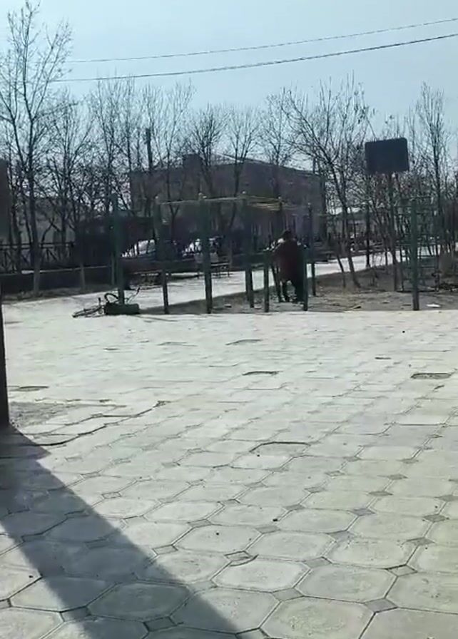 The video depicts an outdoor setting, likely a park or recreational area, on a bright day with a clear, pale blue sky. The ground is paved with geometric, gray tiles that show signs of wear and tear with cracks and discolored areas. To the left of the frame, the edge of a building or wall is visible, with its dark gray surface casting a shadow on the paved ground. A portion of a car mirror is also noticeable. In the center of the frame, there is playground equipment consisting of green support beams and yellow horizontal bars. Two individuals are standing near the equipment. They appear to be engaged in a conversation or interaction. The figures are dressed in what appear to be casual clothes. Beyond the playground equipment, several bare trees are scattered throughout the area, suggesting it may be late fall or early spring. Buildings can be seen further in the background, indicating an urban or suburban setting. A basketball hoop and backboard are visible to the right, standing as another element of the recreational area.