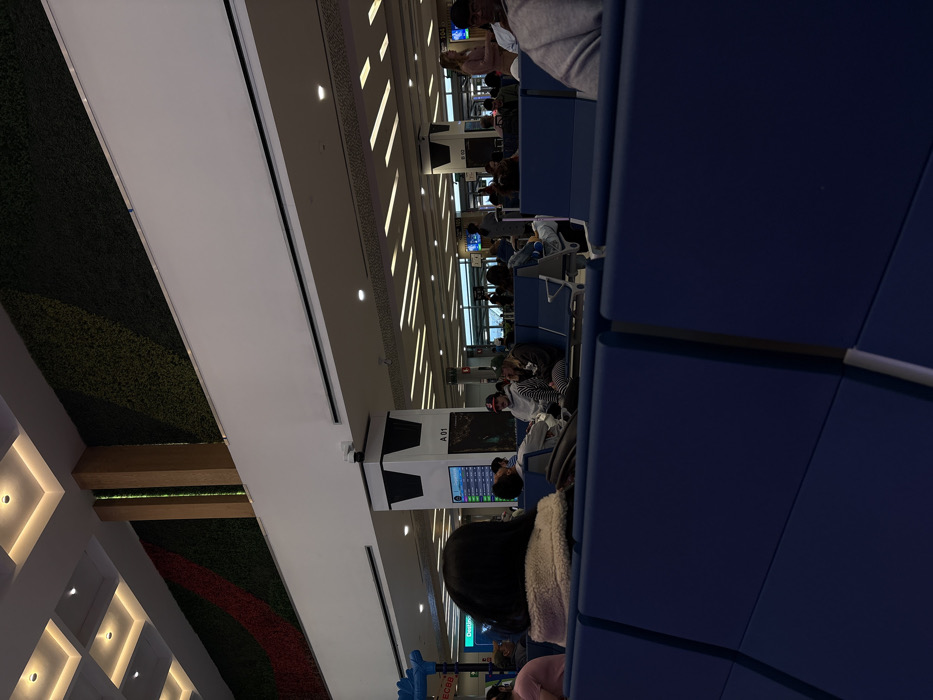 An airport waiting area filled with passengers. Blue seating dominates the foreground. The background features people sitting, with flight information displays interspersed along the waiting area. The ceiling has a patterned lighting system. A wall with artificial greenery and geometric lighting is also visible.