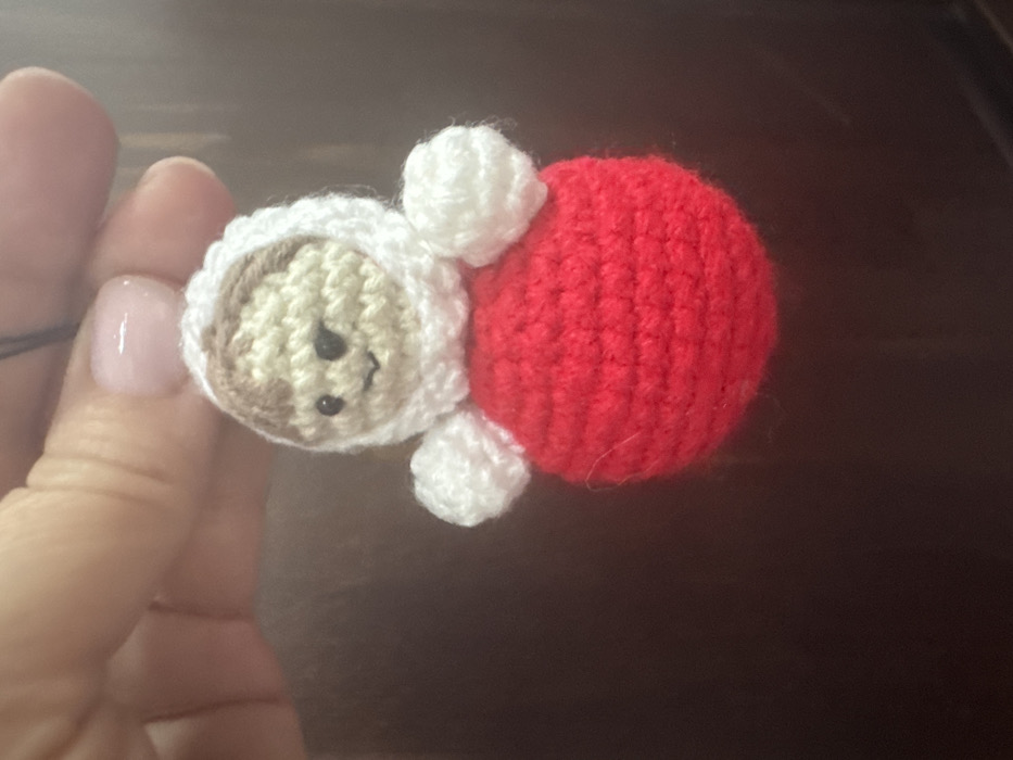A light-skinned hand, with two fingers visible, suspends a small, spherical crocheted doll or ornament against a dark, out-of-focus background