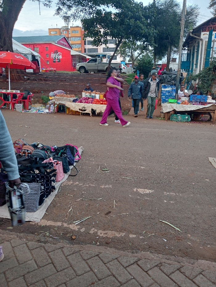 A busy street scene unfolds with roadside vendors displaying fruits, vegetables, and bags on blankets. People are walking about. A woman in scrubs strides across the road. In the background, a red building with a Coca-Cola sign stands near a pickup truck. Market umbrellas provide shade. The road is rough with debris scattered across the surface. The scene appears to capture everyday life in a bustling urban area.