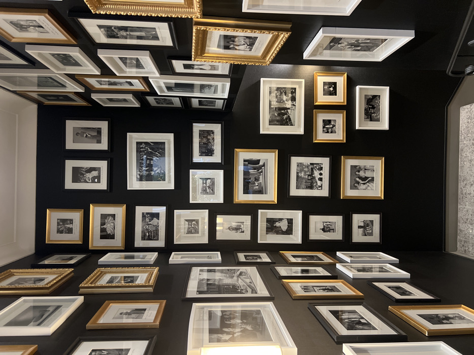 The image displays an interior hallway or staircase landing within a building in Milan, Italy. The exact location is not discernible from the visual evidence. The walls, painted a uniform dark color, are entirely covered by a dense, gallery-style arrangement of framed black-and-white photographs. Frame styles vary, predominantly featuring ornate gold, simple black, and clean white borders, presented in diverse sizes and orientations. The photographic subjects include individuals in formal attire, groups at social events, dancers, and various indoor and outdoor scenes, all rendered in monochrome. The floor is composed of light-toned, textured tiles or terrazzo. Artificial light illuminates the space. A dark metal handrail for a staircase is partially visible on the lower right. No individuals are present in the physical scene.