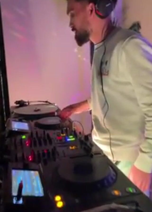 bearded man DJing indoors, wearing a white sweatshirt, light blue jeans, and headphones around his neck