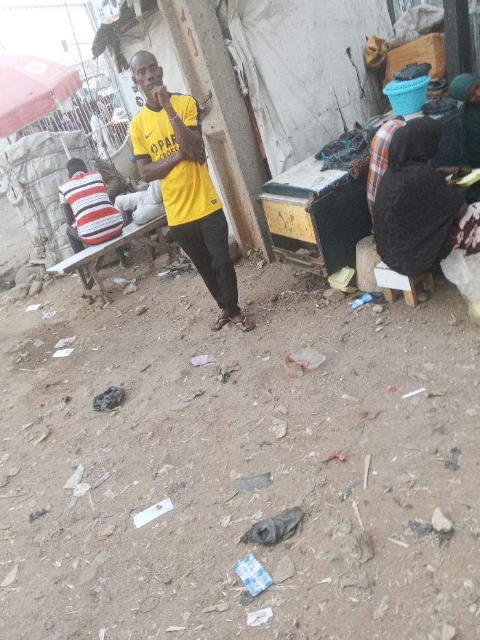 In a crowded, gritty street scene, a man in a yellow shirt and black pants stands near a post. Two people sit on a bench nearby, while others sit on stools at a market stall. The ground is littered with trash. A red umbrella is visible in the background. The scene conveys a sense of urban life and commerce.