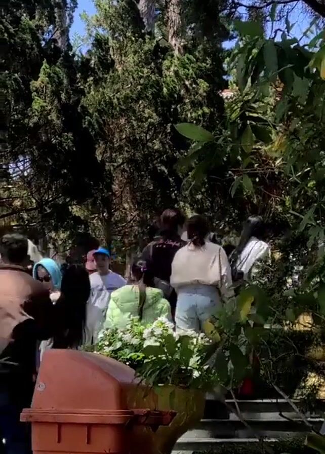 A group of people walk up a short flight of stairs in a park or garden. The group includes both men and women of various ages and attire. Some are wearing jackets, while others are in lighter clothing. The foreground includes a large, rust-colored plastic trash receptacle, a planter with white flowers, and leafy green plants. Behind the group are tall, green trees, and the sky is visible above them. The scene is well-lit, suggesting a sunny day.