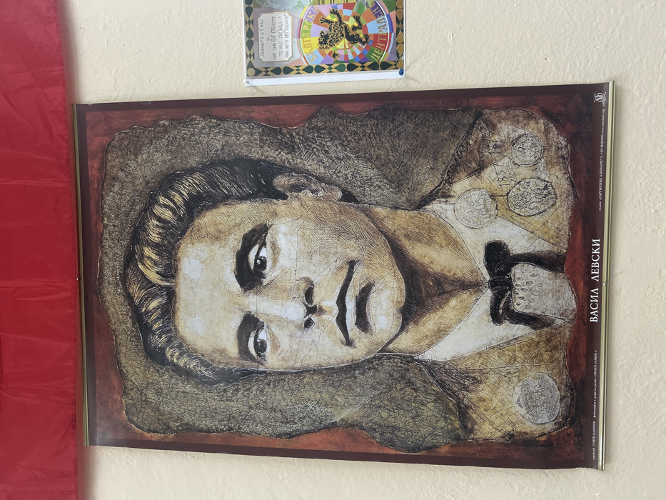 The image displays an indoor scene featuring a prominent portrait poster of Vasil Levski affixed to a light beige wall