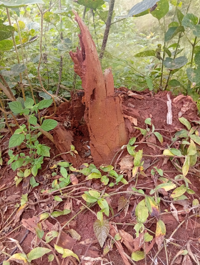 The scene depicts a natural outdoor environment in Ejule, Nigeria, characterized by reddish-brown soil and dense vegetation. Centrally positioned is a substantial, reddish-brown wooden stump or log fragment, approximately 30-40 cm in height, exhibiting advanced decay with splintered edges, irregular surfaces, and visible perforations. The surrounding ground consists of dark reddish-brown lateritic soil, partially covered by smaller fragments of decaying wood and dry organic matter. Multiple green herbaceous plants and trailing vines with oval leaves, some showing minor chlorosis, are growing from the soil in the foreground. The background is composed of a blurred expanse of green foliage and fine, light-colored wispy plant structures, indicating an overgrown, semi-forested area. No individuals, animals, or specific actions are observed.