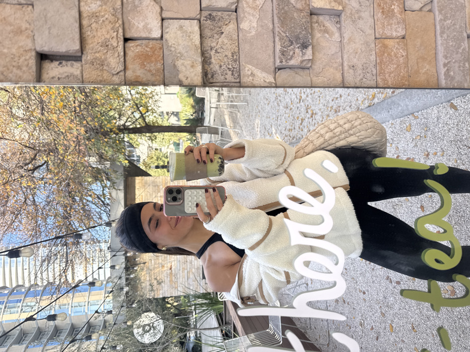 A woman in black leggings and a white jacket takes a mirror selfie with a phone. She holds a bubble tea drink in her other hand. The mirror reflects a building and a tree outside. The mirror sits against a wall of rectangular stones. Part of a white sign with green lettering is visible on the mirror, reading "there".