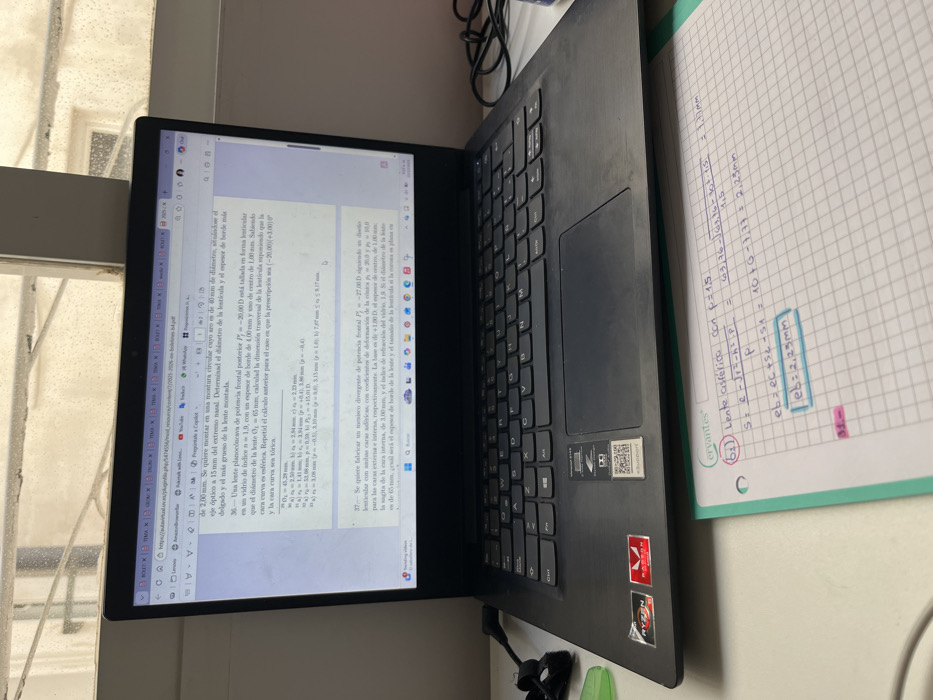 An indoor, eye-level shot focuses on a black laptop open on a light-colored desk, positioned beneath a window exhibiting rain or condensation on the glass and an indistinct building exterior. The laptop screen displays a PDF document from "autoeva.uv.es," containing Spanish text detailing optical problems and lens calculations. Visible stickers on the laptop's palm rest include AMD Ryzen, Radeon, Dolby Audio, and an e-Support QR code. To the left of the laptop lies a coiled black cable and a green object; another black coiled cable rests on the right. In the foreground, a partially visible grid-lined notebook features handwritten optical calculations in Spanish, with "Cervantes" printed at the top. The scene depicts an active study environment. Based on the "autoeva.uv.es" domain, the location is a city in València, Spain.