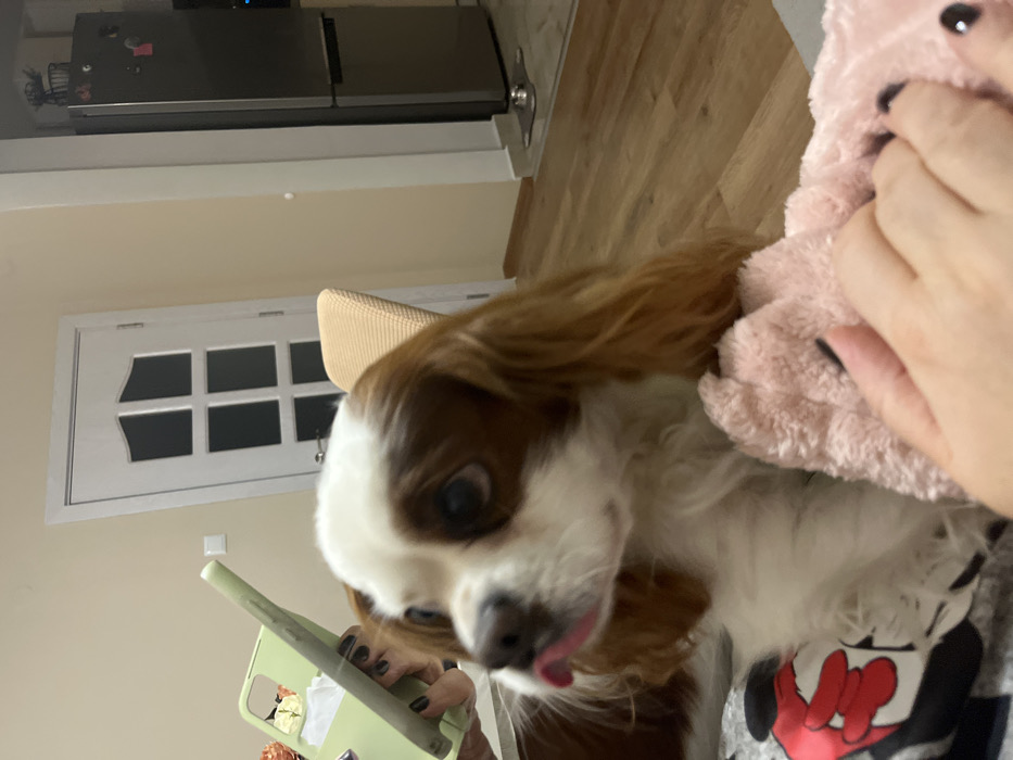 The scene is set indoors in Tsarevo, Bulgaria, depicting a domestic environment. A tri-colored Cavalier King Charles Spaniel, primarily white with brown markings on its head and ears, is positioned in the foreground and mid-ground. The dog is looking towards the left side of the frame, with its pink tongue slightly extended from its mouth. In the upper left, a human hand with black nail polish holds a light green smartphone featuring a distinct camera housing and a ring holder accessory. Another human hand, also with black nail polish, rests on a pink, fluffy textile in the lower right portion of the image. The dog appears to be situated on a patterned surface, partially revealing a black and white design with a red Mickey Mouse graphic on the lower left. The background features a light beige wall. To the left, a white interior door with six frosted glass panels (three stacked vertically on each side) is partially visible. To the right, a stainless steel two-door refrigerator with a dark top appliance is present, suggesting an adjacent kitchen area. The floor throughout the visible space is composed of light wood-toned laminate planks.
