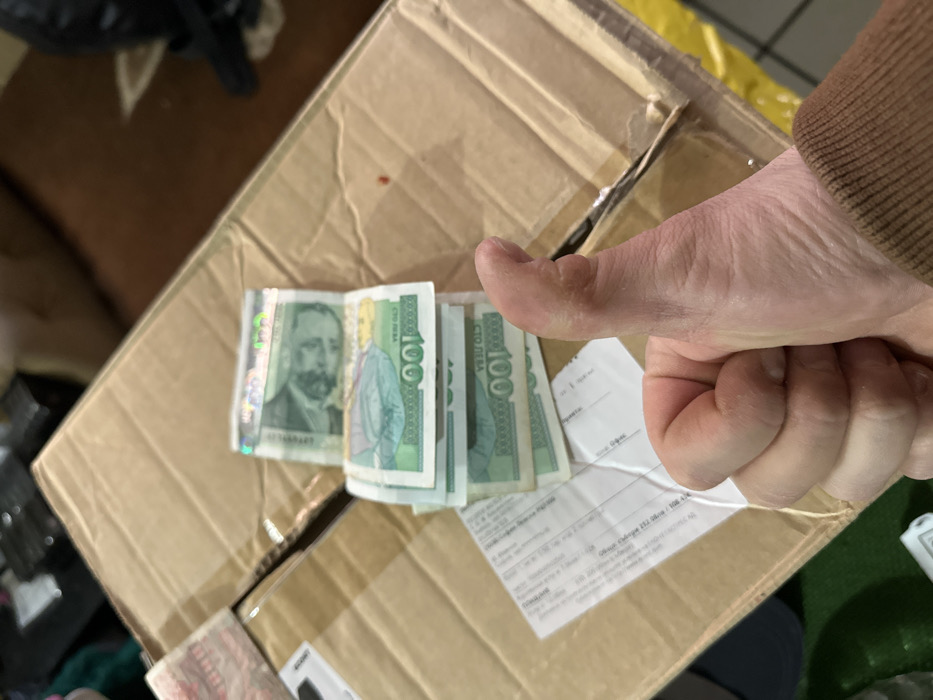 The image depicts an indoor scene in Montana, Bulgaria, captured from an elevated perspective. In the foreground, a human right hand, wearing a brown-sleeved garment, performs a "thumbs-up" gesture. Beneath the hand, a stack of approximately seven to eight Bulgarian 100 Lev banknotes is arranged on a brown corrugated cardboard shipping box. The banknotes are predominantly green, displaying the number "100" and the text "СТО ЛЕВА" (STO LEVA). The top visible note features a portrait, consistent with older series of Bulgarian Lev banknotes (e.g., the 1991-1999 issue featuring Aleko Konstantinov), and includes a holographic security strip. A white shipping label is affixed to the cardboard box, partially obscured by the hand and banknotes. The courier company name "СПИДИ" (SPEEDY) is clearly legible on this label, indicating a Bulgarian shipping service. The cardboard box itself shows minor creasing and appears to be slightly open or damaged along a seam on its right side. The background is out of focus, revealing indistinct elements of an indoor environment. Visible details include a dark, patterned floor or surface, and blurry objects suggesting furniture or shelving. A bright yellow strip is visible along the bottom right edge of the frame.