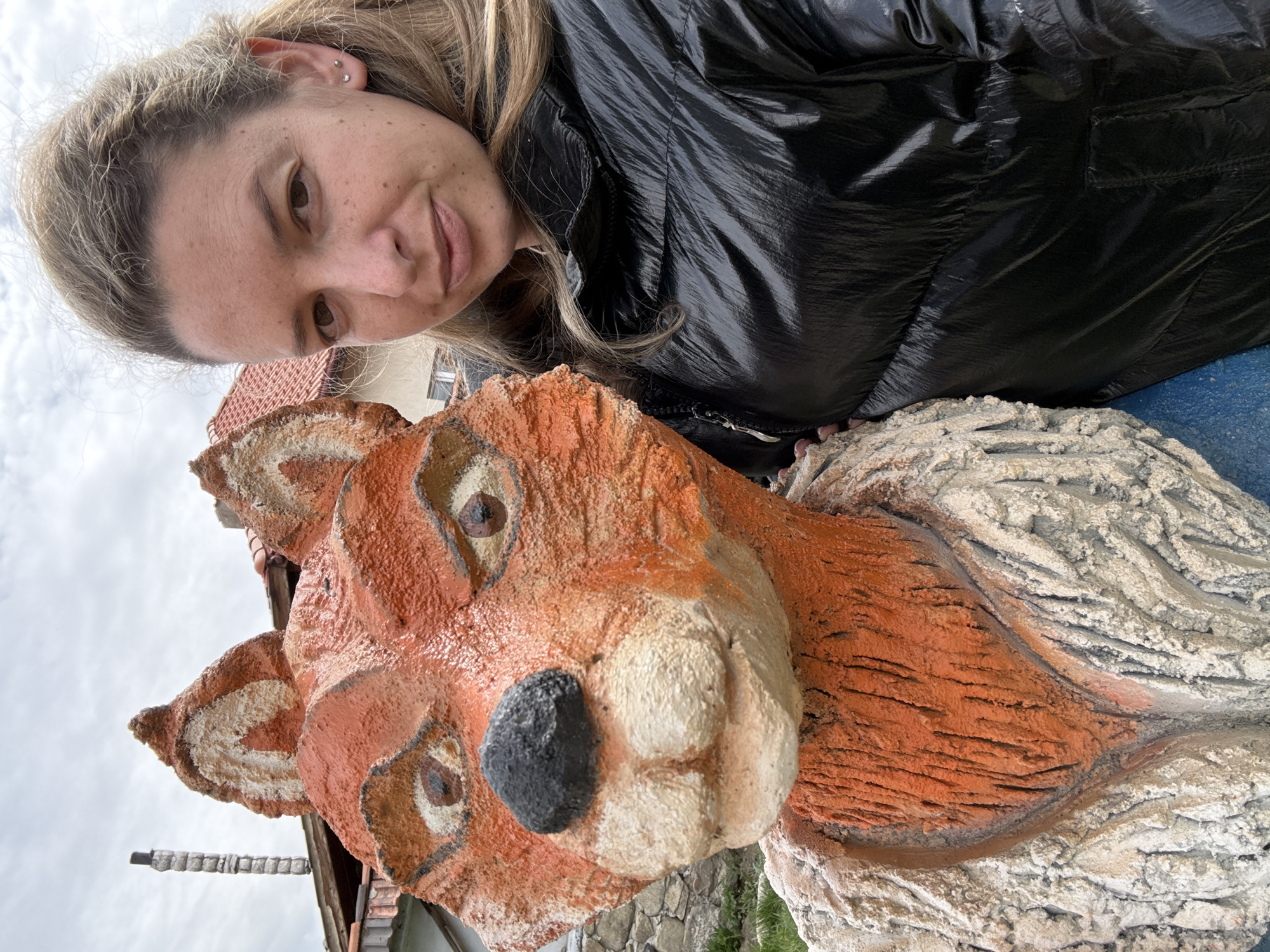 A woman is posing for a selfie with a large sculpture of a fox. The woman is fair-skinned with blonde hair and is wearing a black puffy jacket. The fox sculpture is made of concrete and painted with orange and white hues. It is located outdoors and appears to be on a rooftop. The city of Zlatitsa, Bulgaria, cannot be determined from this image.