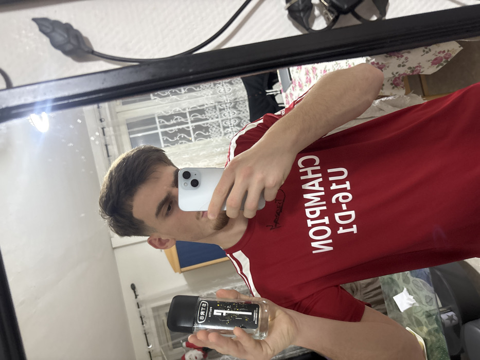A man in a red Adidas t-shirt is reflected in a mirror. He holds an iPhone in one hand and a small, rectangular bottle with a black cap and a transparent label in the other. The t-shirt has white text. The mirror has a black frame with a decorative leaf-like element on the upper left. The background shows part of a window with patterned curtains. The reflection shows a glimpse of furniture.