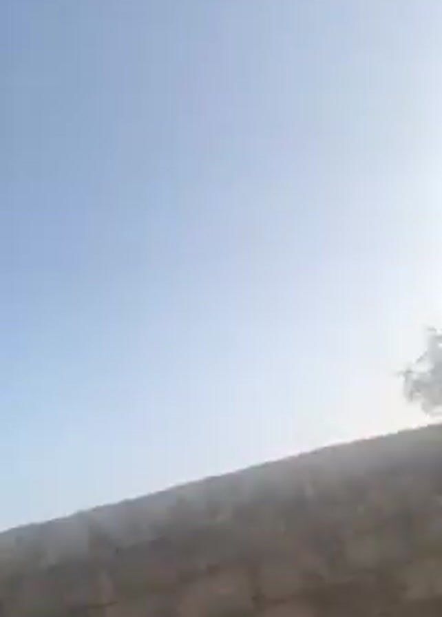 dirt road in what appears to be a village. The road is lined with simple buildings made of mud or concrete. There are people standing around near a motorcycle on the right side of the road. Chickens are walking around in the road. A man in a white outfit walks along the left side of the road. There are utility poles with wires visible overhead. The sky is clear and blue. The video seems to be taken from someone walking down the road.