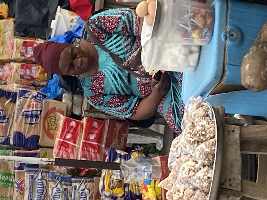 An adult female, wearing a maroon headwrap, gold earrings, and a teal and maroon patterned dress, is seated in a street vendor's stall in Lokoja, Nigeria