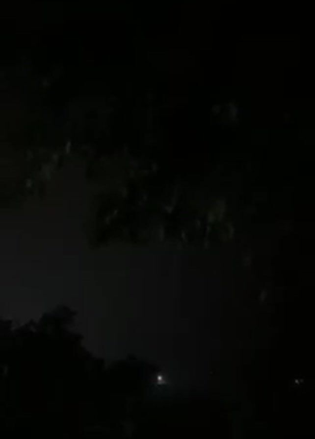 nighttime scene with trees in silhouette against a dark sky. A flash of light illuminates the scene, changing the sky to a purple hue. Another flash occurs, and then the scene returns to darkness. A faint light can be seen in the distance. The sound of thunder can be heard.