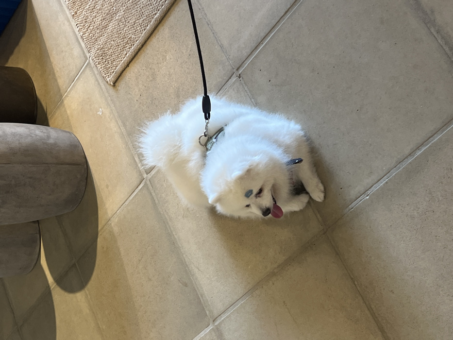 A white, fluffy dog, possibly a Pomeranian or American Eskimo, rests on a tiled floor with its tongue sticking out. It is wearing a leash. Next to the dog are some neutral-colored, round furniture pieces. Part of a beige rug is also visible in the background. The lighting is bright, highlighting the dog's white fur and the texture of the tiles.