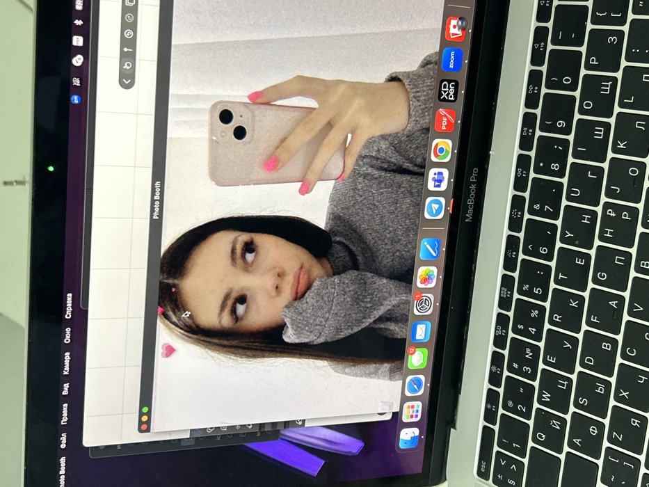 A silver MacBook Pro laptop, featuring a Cyrillic keyboard layout, is displayed from a slightly elevated perspective. The laptop screen shows the macOS desktop with an active "Photo Booth" application window in the foreground, titled in Russian. A small green indicator light is illuminated next to the laptop's webcam. Inside the "Photo Booth" window, a young female with long, dark hair and wearing a grey knitted sweater is captured in a live camera feed. She is looking towards the right side of the frame (her left), with her left hand, covered by her sweater sleeve, resting near her chin. Her right hand, exhibiting bright pink manicured fingernails, holds a light pink smartphone with a dual-camera module and a shimmering case towards the laptop's camera. Digital pink heart overlays are visible on the screen near her head, indicating a filter is in use. The background within the Photo Booth feed appears to be a light-colored wall or curtain. The MacBook's macOS menu bar and dock, displaying various application icons (some with notification badges), are visible below and above the main window. This scene is located in Novosergievka, Russia.