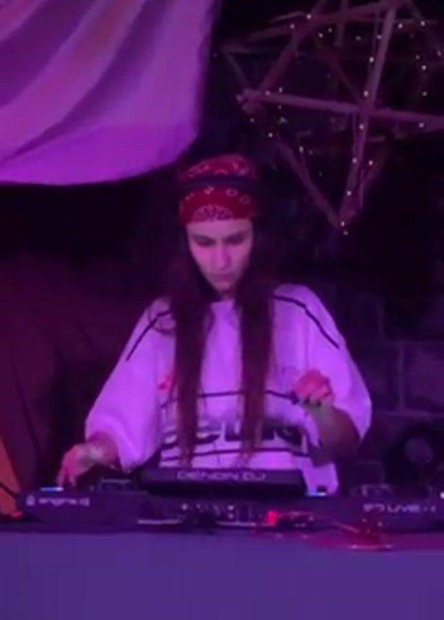 A woman is DJing at night, standing behind a Denon DJ system. She's wearing a white t-shirt and a red bandana. The lighting is predominantly purple. In the background is what appears to be a wooden structure and a draped cloth.