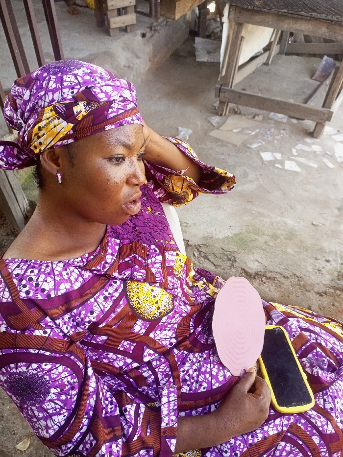 A single adult female is depicted outdoors in Zango-ndaji, Nigeria. She is seated, angled with her body slightly left and her head turned to her right, her mouth slightly open. She wears a matching purple, white, brown, and yellow patterned Ankara headwrap and dress. Small silver hoop earrings are visible. Her right hand is raised near her temple. Her left hand rests on her lap, holding a light pink, oval-shaped object featuring a concentric ripple pattern. A black smartphone in a yellow case is positioned on her lap, adjacent to her left hand. The background consists of a concrete or dirt ground scattered with small white debris, and various wooden structures, likely elements of stalls or scaffolding, are present in the upper-left and upper-right portions of the frame.