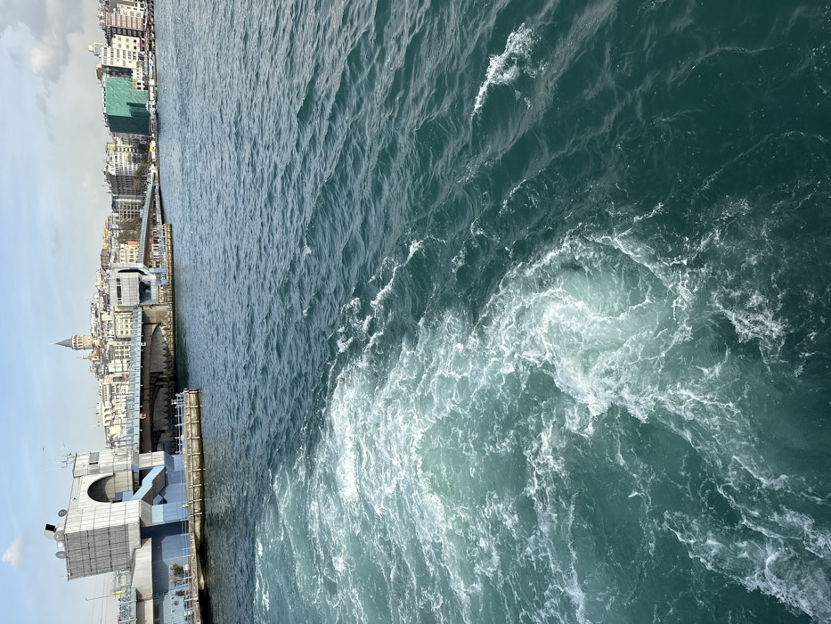 The image displays a panoramic view from water towards the Beyoğlu district of Istanbul, Turkey, under a partly cloudy sky. The foreground features the turbulent wake of a vessel, characterized by white foam and churning dark teal water in the lower-left quadrant, gradually transitioning into rippled, dark teal water across the rest of the lower frame. In the midground, the Galata Bridge spans the waterway, distinguished by two light-colored, multi-story bridge houses or pavilions situated on its left section. Small figures, identifiable as pedestrians and vehicles, are visible traversing the bridge structure. The background comprises the urban landscape of Beyoğlu, dominated on the left by the cylindrical stone structure and conical roof of the Galata Tower. Multiple multi-story buildings populate the city skyline, with one large building on the far right partially obscured by green construction scaffolding or netting. No specific individuals are clearly identifiable.