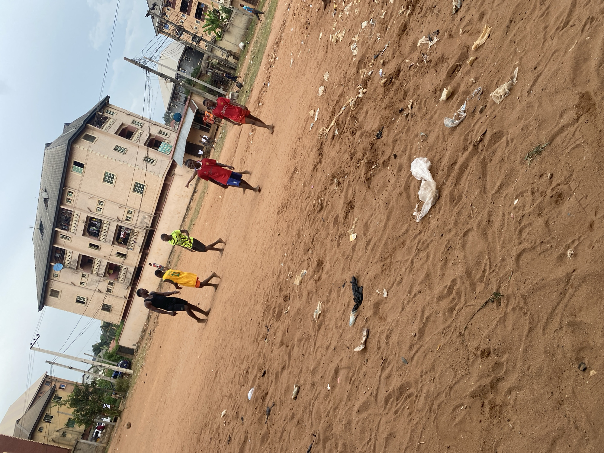 n outdoor scene in Onitsha, Nigeria, with a dirt ground covered in trash. Four people are scattered across the scene, appearing to be playing. The individuals are wearing athletic clothing: red jerseys, yellow and black jerseys, and a black tank top. In the background, there are buildings including a four-story apartment complex. Overhead power lines are visible.