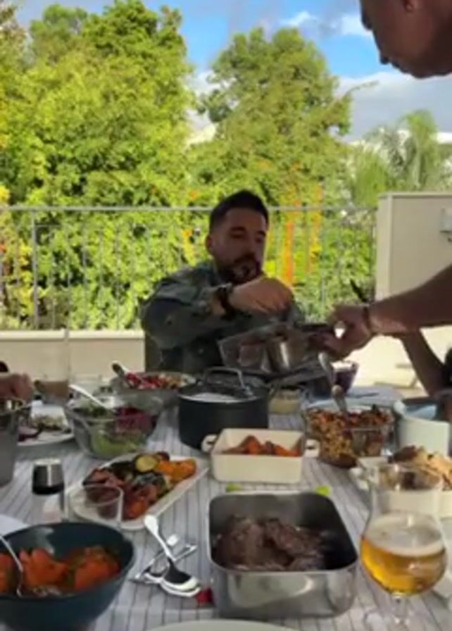 The scene captures a casual outdoor dining setting with multiple people gathered around a table laden with various dishes. A man in a green jacket sits at the table, focused on his plate as he receives a portion of food from another man standing over him. The server is using a utensil to transfer the food from a rectangular metallic container to the diner's plate. The table is covered with a striped tablecloth and holds an assortment of dishes, including salads, roasted vegetables, a pot, a bowl of orange-colored food, and a container of what appears to be meat. A glass of beer stands near the edge of the table. The background reveals a balcony with a metal railing, lush green trees, and a partially visible blue sky with clouds. The atmosphere appears relaxed and social, suggesting a shared meal among friends or family.