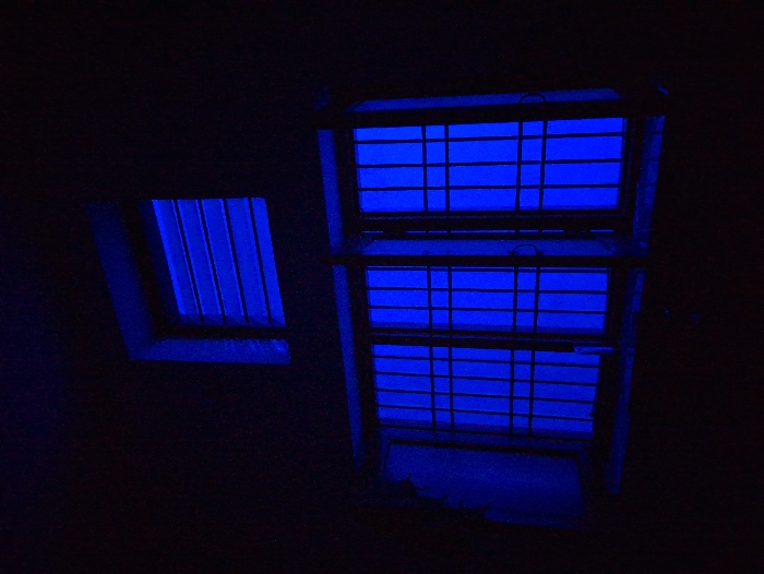 The image depicts two windows, one small and one large, set into a dark wall. Both windows are illuminated by a striking blue light shining through the bars of the window guards. The larger window is composed of multiple sections, one of which is open. The room is extremely dark with only the windows visible in the intense blue light.