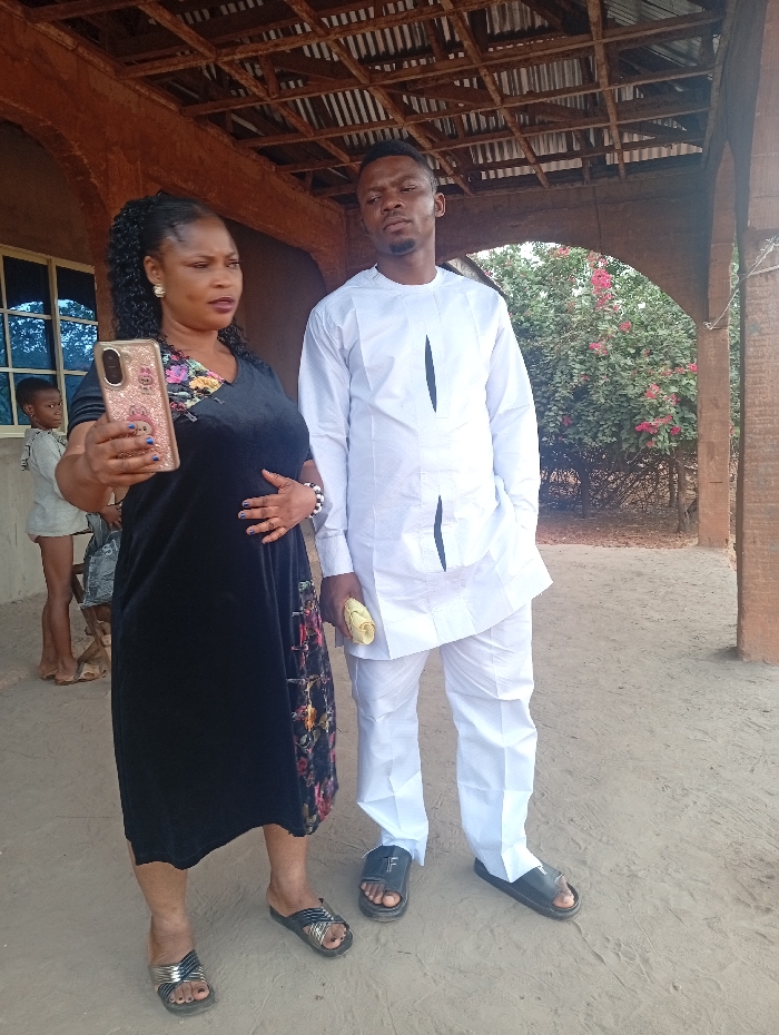 The image portrays an outdoor scene in Ugwolawo, Nigeria, beneath a sheltered structure featuring reddish-brown support beams and corrugated metal roofing. Three individuals are present. In the foreground, a woman with dark skin and dark, curly hair stands facing slightly left, holding a rose gold-colored smartphone with a decorated case in her right hand, pointed towards herself and the man. Her left hand rests on her midsection. She is dressed in a black, V-neck dress with a floral pattern on the lower right side and black and silver slip-on sandals. To her right, a man with dark skin, short dark hair, and a light beard stands facing forward, looking slightly to his left. He wears a white long-sleeved tunic with vertical black accents, white trousers, and black slip-on sandals with a white "F" logo. He holds a yellowish, rolled-up object in his right hand, positioned by his side. A young child, partially visible, stands in the background to the left of the woman, wearing a light-colored shirt. The ground surface is sandy. In the background, a building wall with a white-framed window is visible on the left, and through an archway on the right, green foliage with red flowers is discernible.