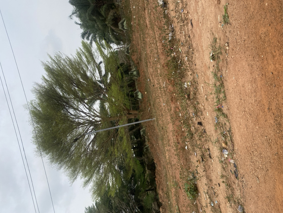 The image depicts an outdoor landscape in Owo, Nigeria, under an overcast sky. The foreground consists of a reddish-brown dirt path or unpaved road, littered with various debris including plastic wrappers and discarded items. This path ascends gradually towards the right. Beyond the path, a sloping terrain of reddish-brown earth is sparsely vegetated with weeds and also contains scattered litter. A large deciduous tree with a wide, light green canopy dominates the central-left background, its trunk and major branches visible. A grey utility pole stands vertically in front of this tree. Two overhead utility wires stretch horizontally across the upper portion of the frame. In the background, behind the primary tree and the slope, denser foliage includes dark green palm trees on the right and other green trees on the left. A line of green-painted, triangular concrete barriers or bollards is positioned along a raised bank or boundary line in the far background. No individuals or specific activities are visible.