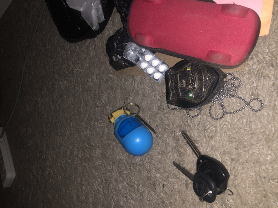 A cluster of disparate objects on a carpeted floor includes a black trash bag, a red rectangular case, a blister pack of pills, and a police badge with a chain. Nearby, there's a blue object resembling a grenade, and a set of car keys. A small white electronic device sits on the edge of the carpet.