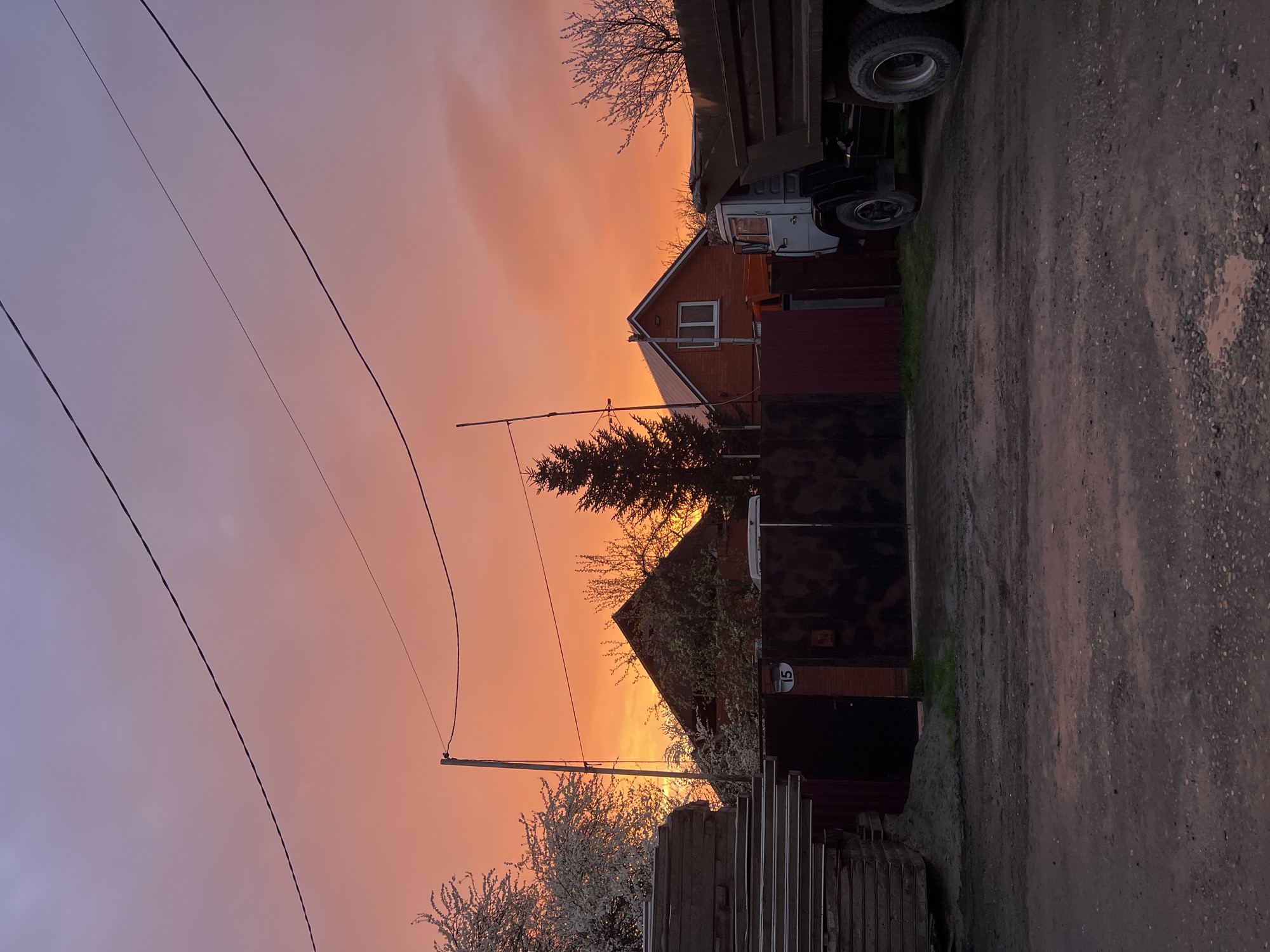 The image captures a street scene in Beryozovy, Russia at dusk or dawn. The sky is a gradient of orange near the horizon to violet higher up, crisscrossed by power lines. A red brick house is visible behind a dark fence; a truck is parked nearby. A second house is seen further down the street, also behind fencing and foliage. The road appears unpaved and possibly damp. A number "15" is affixed to the fence on a white oval background. Blossoming trees and other bare-branched trees are also in the scene.