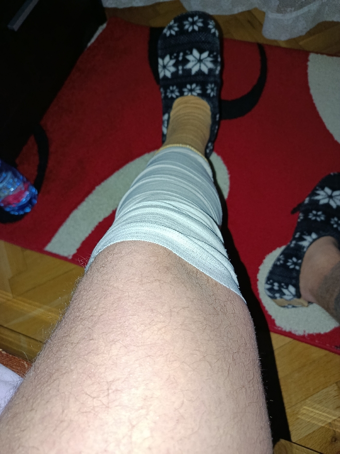 The image displays the lower extremities of an individual in an indoor setting within Sofia, Bulgaria. The left leg is prominently featured, with a light-colored elastic bandage wrapped circumferentially around the lower calf and ankle. Beneath the bandage, a tan-colored underwrap or sock is visible. The left foot is covered by a dark-colored slipper adorned with white snowflake patterns. The portion of the leg above the bandage, extending towards the knee, is visible and covered in fine body hair. The right foot, wearing a matching dark-colored snowflake-patterned slipper, is partially visible on the right side of the frame. The legs rest on a red area rug featuring large abstract white and black curvilinear designs. Wood flooring is visible around the edges of the rug. A blue plastic bottle is partially observed on the rug to the far left. Lighting conditions suggest an interior, possibly artificial light source.