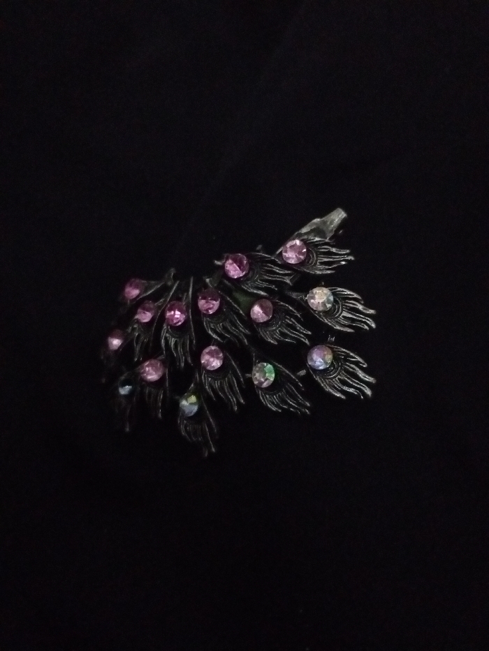 - "A metallic brooch, designed in the shape of fanning peacock feathers, is depicted against a solid black background" by FM-CuvaI2, licensed under CC BY 4.0