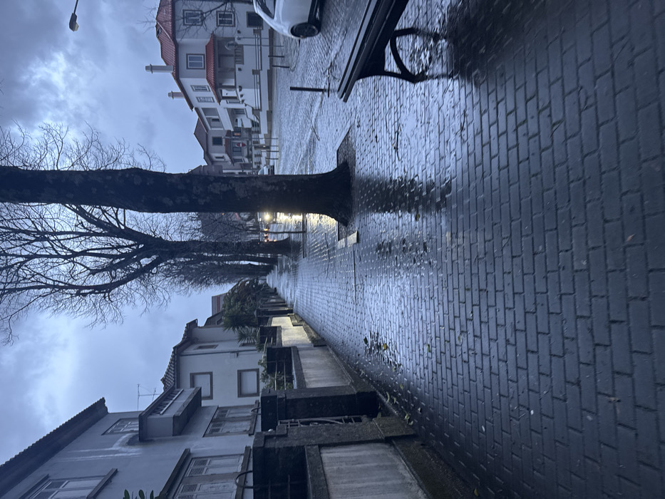 A rainy street scene shows buildings lining the left side. A row of bare trees extends along the sidewalk, their trunks appearing to emerge from the pavement. The wet brick sidewalk reflects light, creating a shiny, textured surface. A bench is visible on the upper right, also glistening with rain. Overcast skies add to the gloomy atmosphere. The scene conveys a sense of urban tranquility on a wet day.