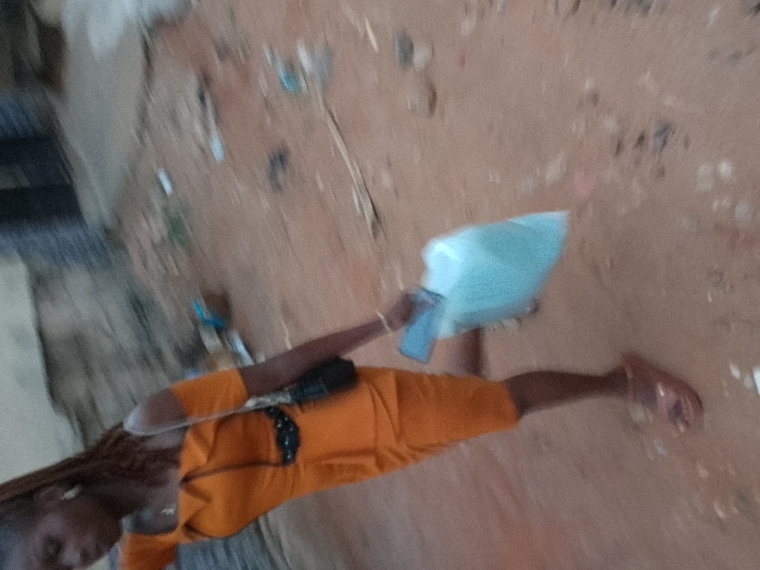A person in an orange dress stands outside, holding a light blue plastic bag and a blue smartphone. They wear brown sandals. The ground appears to be dirt, scattered with trash. A concrete structure is on the left. The photograph is rotated.