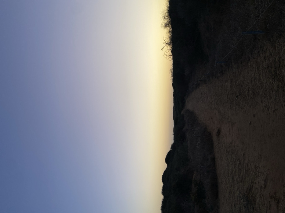 A dusky landscape is split between sky and land. The sky graduates from a deep blue on the left to a pale yellow horizon. On the right, a dark, overgrown hill slopes down. A sandy path winds along the hill's edge. Sparse vegetation clings to the slope, silhouetted against the fading light. A fence post stands at the top of the hill. The overall mood is somber and tranquil.