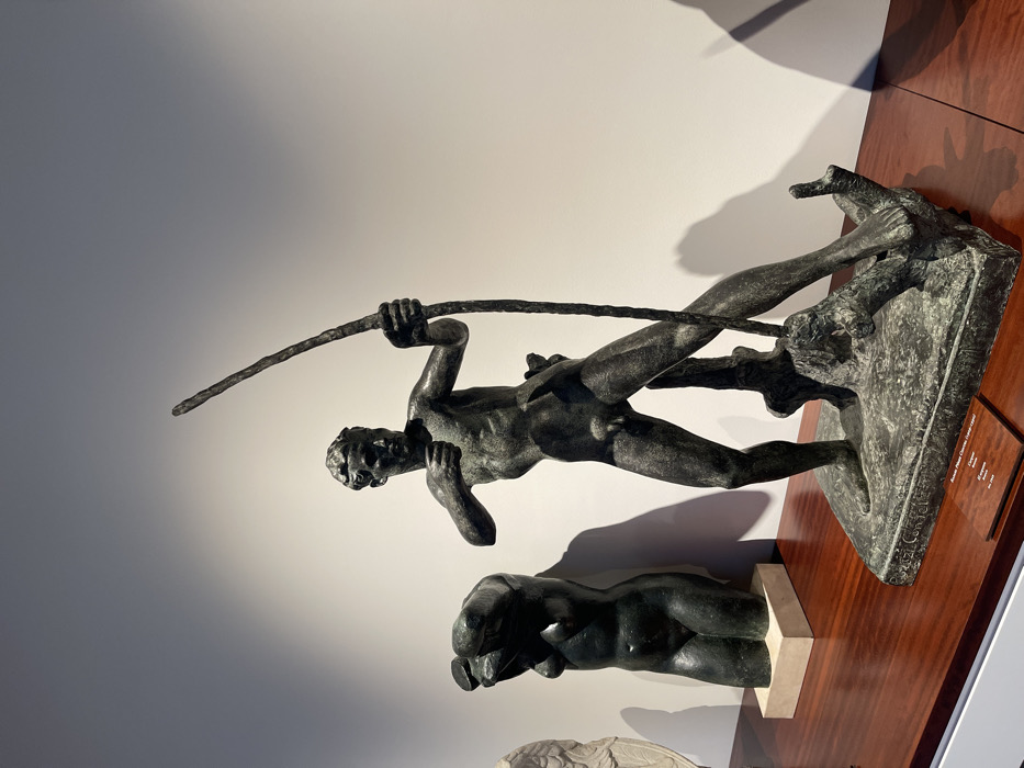 The image depicts an interior view of an art gallery or museum in València, Spain, likely the Institut Valencià d'Art Modern (IVAM). The primary subject is a dark bronze sculpture titled "El arquero" (The Archer), created circa 1945 by Roberto Pissas Clavello. This sculpture portrays a nude male figure with a youthful physique, captured in a dynamic pose as if drawing a bow. The figure stands with his right leg bent and left leg extended backward, his torso angled forward. Both arms are raised, holding a textured, irregular bow vertically. The head is turned slightly to the left, exhibiting a focused expression. The sculpture rests on an integrated, textured bronze base featuring organic forms resembling tree stumps or rocks. To the left and slightly behind "El arquero," a second, partial dark bronze sculpture is visible. This depicts a headless and armless male torso, positioned on a light-colored rectangular plinth. Both sculptures are displayed on a polished, dark brown wooden surface, possibly a large table or plinth. In front of "El arquero," a small wooden information label identifies the artist as Roberto Pissas Clavello (1918-1994), the work as "El arquero," the material as "Bronce" (Bronze), and the approximate creation date as "c. 1945." The background consists of plain white or off-white walls, illuminated by overhead lighting that casts soft shadows from the sculptures onto the wall. The environment is typical of a well-maintained exhibition space.