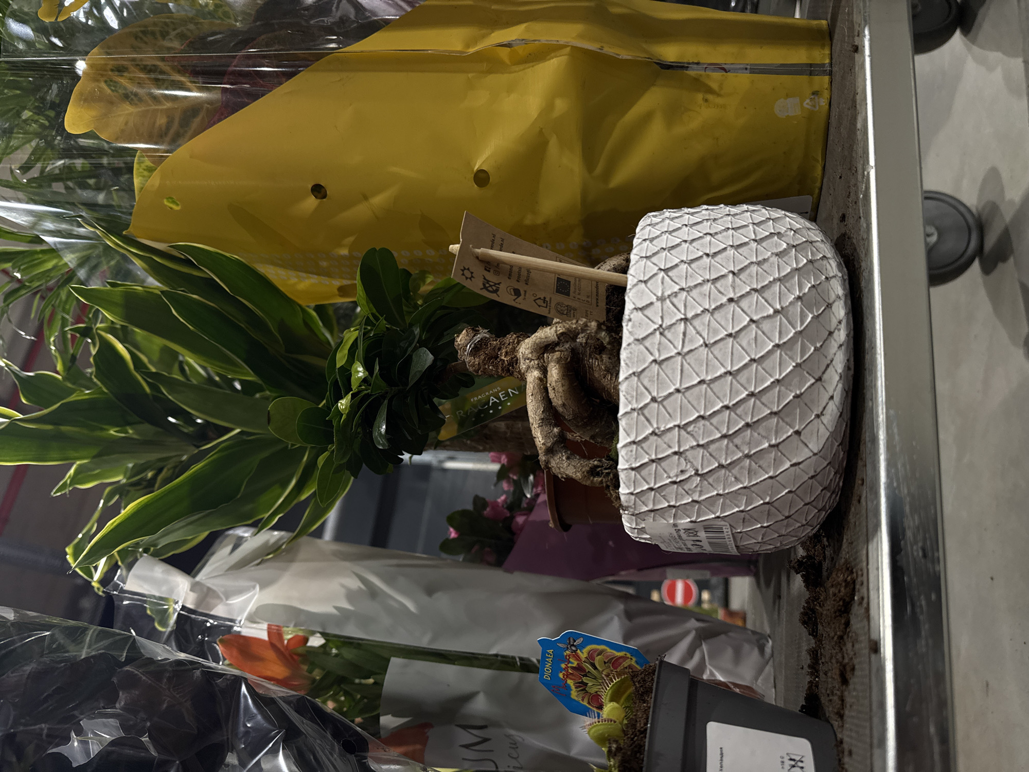 The scene depicts a plant display within a retail store environment in Sofia, Bulgaria. The primary subjects are various potted plants arranged on a silver-colored metal display cart equipped with wheels. In the immediate foreground, a white, spherical pot with a woven, diamond-patterned texture contains a plant exhibiting prominent, gnarled roots above the soil, resembling a Ficus ginseng or similar species. A small wooden stick with a white product tag, partially displaying "mondverde.nl" and care symbols, is inserted into the pot. To the left, a smaller gray plastic pot holds a Venus flytrap (Dionaea muscipula), identifiable by its characteristic traps and a blue-and-yellow label featuring an illustration of the plant and a fly, with the text "DIONAEA." Loose, dark brown soil is scattered on the metal surface of the cart around these two pots. The midground features additional plants, many encased in clear plastic packaging. A tall plant with variegated green and yellow leaves is visible directly behind the white pot. To the left, an orange-flowered plant is partially visible within its clear plastic and white paper wrapping. To the right, a large, crinkled yellow plastic bag, likely packaging for another plant, stands upright. Further back, a plant with pink blossoms is visible within a purple wrapper. The background shows the interior of a commercial building, indicating a plant section of a supermarket, garden center, or DIY store. A red and white circular "No Entry" sign is visible in the distant left. The overall lighting is artificial. No individuals are present in the frame, and no direct actions or interactions are occurring. The scene presents a static display of merchandise. Bulgarian text ("ХОЛАНДИЯ" - Holland) visible on a label confirms the geographical context.