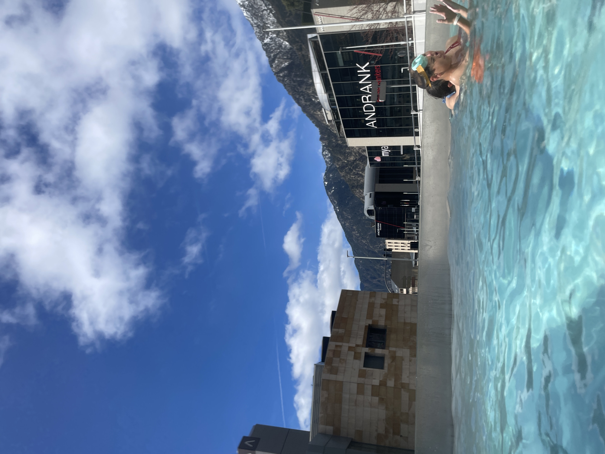 A swimmer wearing goggles and an orange top is in a pool of clear blue water. The location is likely the city of Les Escaldes, Andorra, as evidenced by the prominent "ANDBANK" building in the background. The building, with modern glass architecture, features the bank's logo. The foreground shows the pool's edge. In the distance is a partial view of mountains, with snow visible on the higher slopes, and a bright blue sky with scattered white clouds. Other buildings are also visible, including a beige-tiled structure.