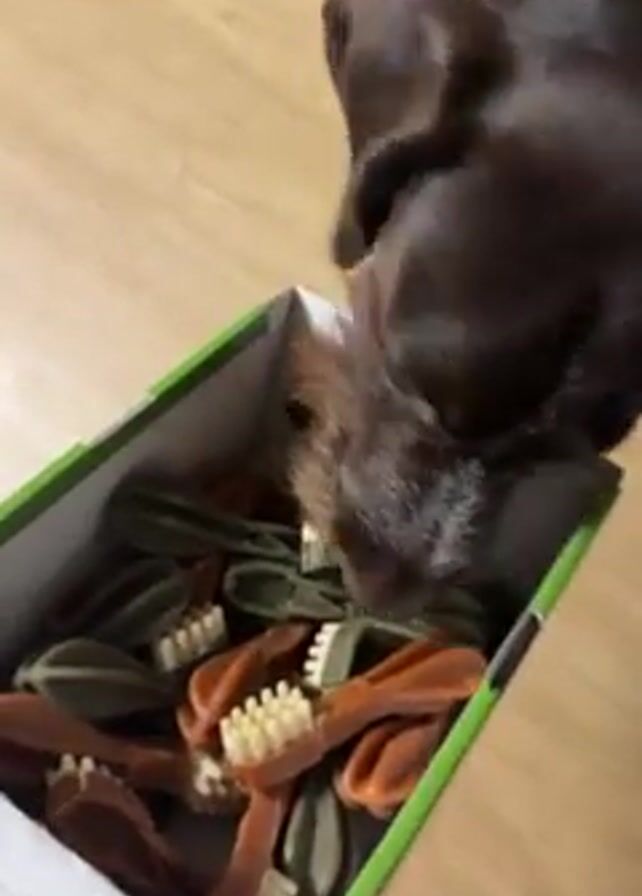 - "A brown dog is sniffing inside a box filled with dog treats that resemble toothbrushes" by FM-8ALHx1, licensed under CC BY 4.0