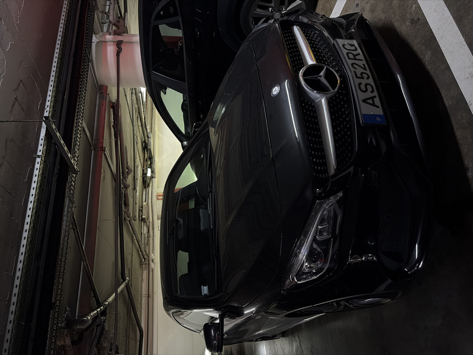 A black Mercedes-Benz sedan or coupe, featuring the Portuguese license plate "AS 52 RQ", is parked in an underground parking garage in Funchal, Portugal
