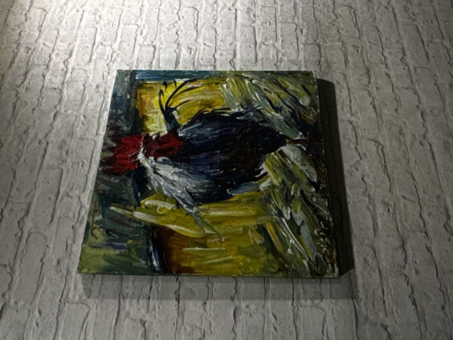 An impasto painting of a chicken is set against a background of yellow and green tones. The chicken itself features strokes of red, black, and white paint. Thick application of paint creates depth and texture throughout the composition. The painting is displayed on what appears to be a brick surface. Lighting is uneven, casting shadows across both the painting and its surroundings.