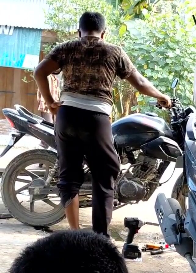 From a low angle, a person wearing a brown shirt and black pants stands behind a black motorcycle. They have their left hand on their hip and their right hand on the handlebar. A drill and some other tools lie on the ground next to the motorcycle. The setting appears to be an outdoor workshop. The camera angle shifts slightly to the left, then back to the initial position. Another person is visible in the foreground, with only the back of their head in view. A sign is visible in the background. The motorcycle appears to be undergoing repairs.