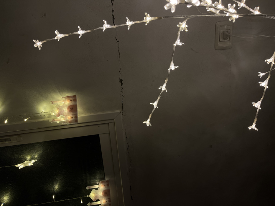 The image displays an indoor scene at night, likely within a residence in Nuseirat, Palestinian Territory, illuminated by decorative lights. In the upper left quadrant, a white-framed window with dark glass is visible, reflecting internal lights. String lights with warm yellow illumination are present; one mosque-shaped light is affixed to the wall beside the window frame, and another identical light is visible through the window. A star-shaped light is also seen near the top left of the window. The wall beneath the window exhibits prominent horizontal cracking. On the right side of the frame, a decorative light tree or branch, adorned with numerous small, translucent, white, flower-shaped LED lights emitting a bright white glow, extends vertically and horizontally. This light tree is plugged into a light-colored two-prong electrical outlet located on the wall in the lower right. The walls visible in the scene are a light, possibly off-white or beige color, and show additional horizontal cracking. No individuals or specific activities are depicted.